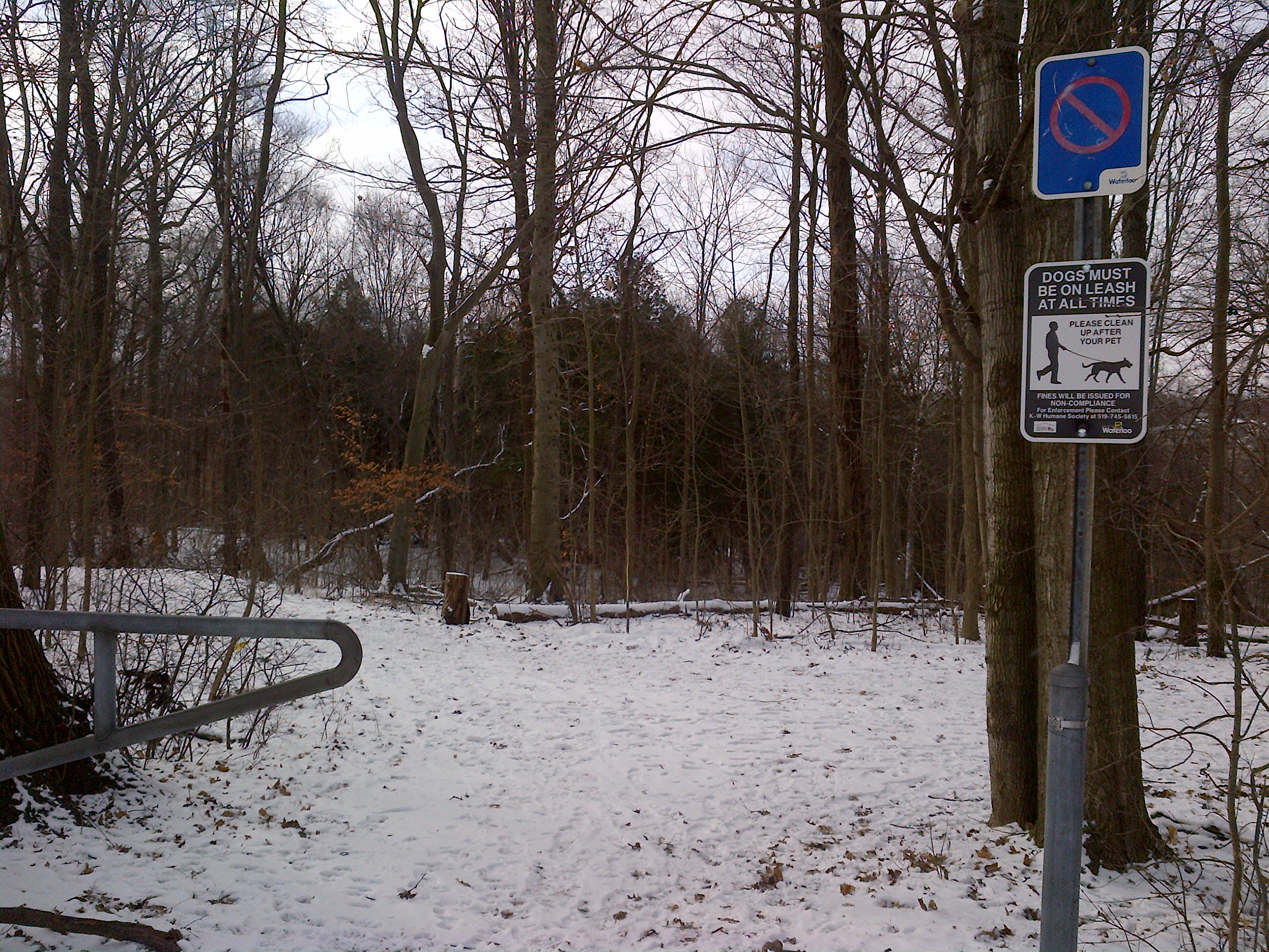 Although cycling is not permitted in the woodlot, it is a popular spot for dog walkers (Ontario Trail Council, 2014). The area is full of lovely vistas that belie the urban sound of traffic in the distance. Trees species include red oak, bur oak, black cherry, and hemlock groves. Hemlock trees provide the space with a reflective, Japanese-garden appearance even in the depths of winter. Alternate leaf dog wood and yellow birch adorn the understory and reflect the health of this relatively old, urban woodlot.