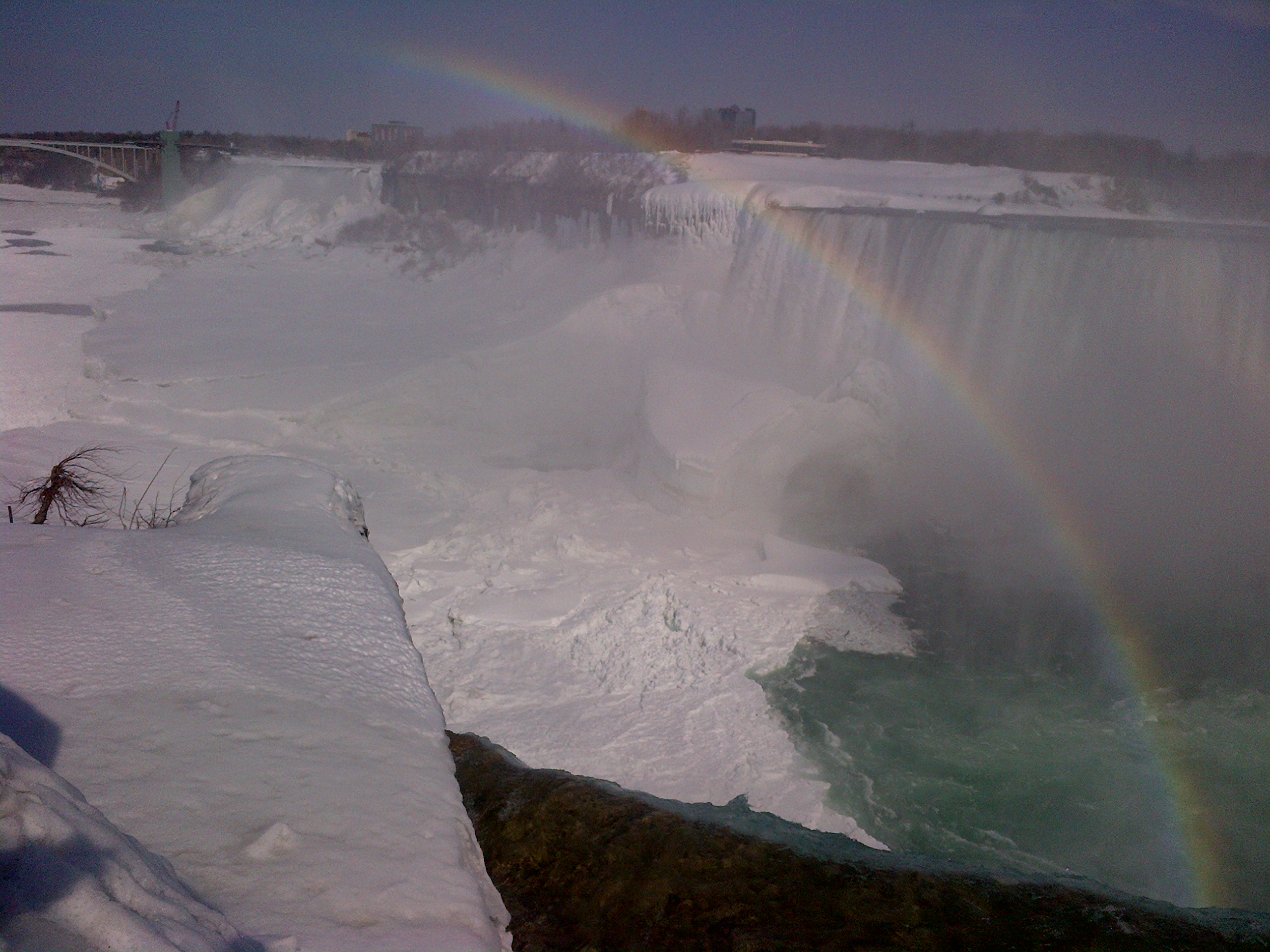 During my March Break wanderings with my mother as my traveling companion, I had the chance to see Niagara Falls in a state of semi-solidity. The term “Niagara Falls” refers to the city of Niagara Falls, Ontario, Canada; the tourism industry in and around Niagara Falls; and the three waterfalls which are the namesake and centerpiece of the entire area. The three waterfalls which constitute Niagara Falls include the Horseshoe Falls, the American Falls and the Bridal Veil Falls; they each straddle the international border between Ontario, Canada and the state of New York in the United States (Wikipedia article).