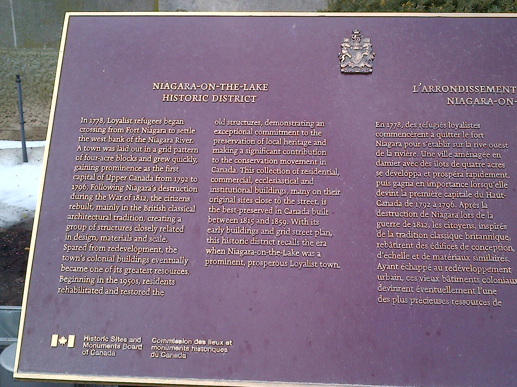 “Niagara-on-the-Lake teems with historical plaques, many national and provincial, reflecting its significance in the establishment of many of the province’s institutions. Among these were its first newspaper, lending library, parliament, historical museum, and governing body for the legal profession. Critical battles in the defence of Upper Canada took place here, at Queenston, including one in which heroine Laura Secord gained her fame. The town gave many black Americans their first taste of freedom, both as a stop on the Underground railroad for those travelling further into Upper Canada, and as a refuge in its own right. Its stock of Regency and Classical Revival buildings, considered the best in the country from the post-war of 1812 period, led the Historic Sites and Monuments Board of Canada to recommend that the town’s historic district be designated a National Historic Site of Canada, a designation which was approved in 2003″ (Wikipedia article).
