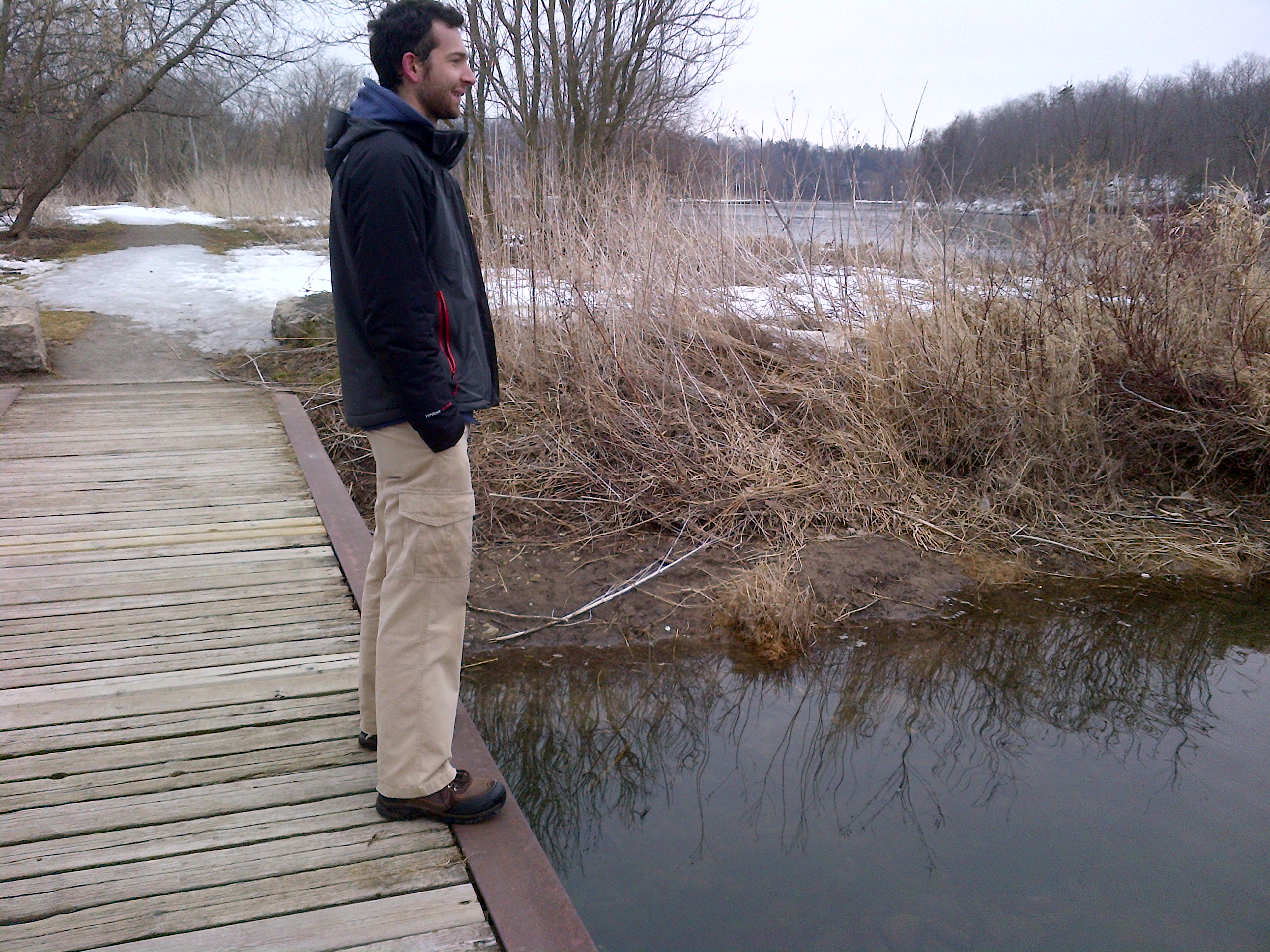 Although I have been to Preston many times in my life, the Bob McMullen Linear Trail was a pleasant surprise for me. This natural trail is normally covered in manicured stonedust as it follows the floodplain from Hamilton Street to the Preston Auditorium (City of Cambridge, 2014). We walked the entire length of the trail and found that treacherous ice still covered much of it after this year’s harsh winter. Our walk was slow as a consequence, though this situation seemed unimportant given the prevalence of birds that we observed during our walk.