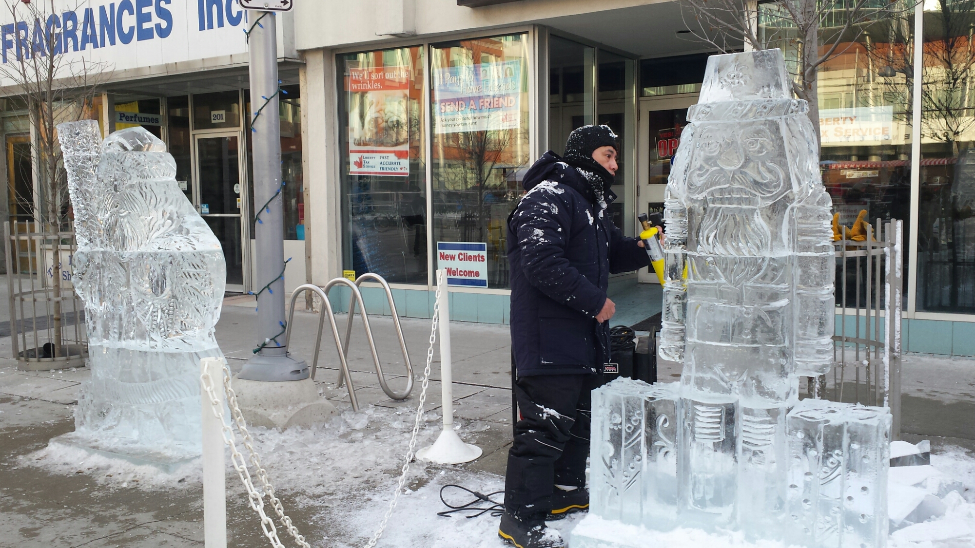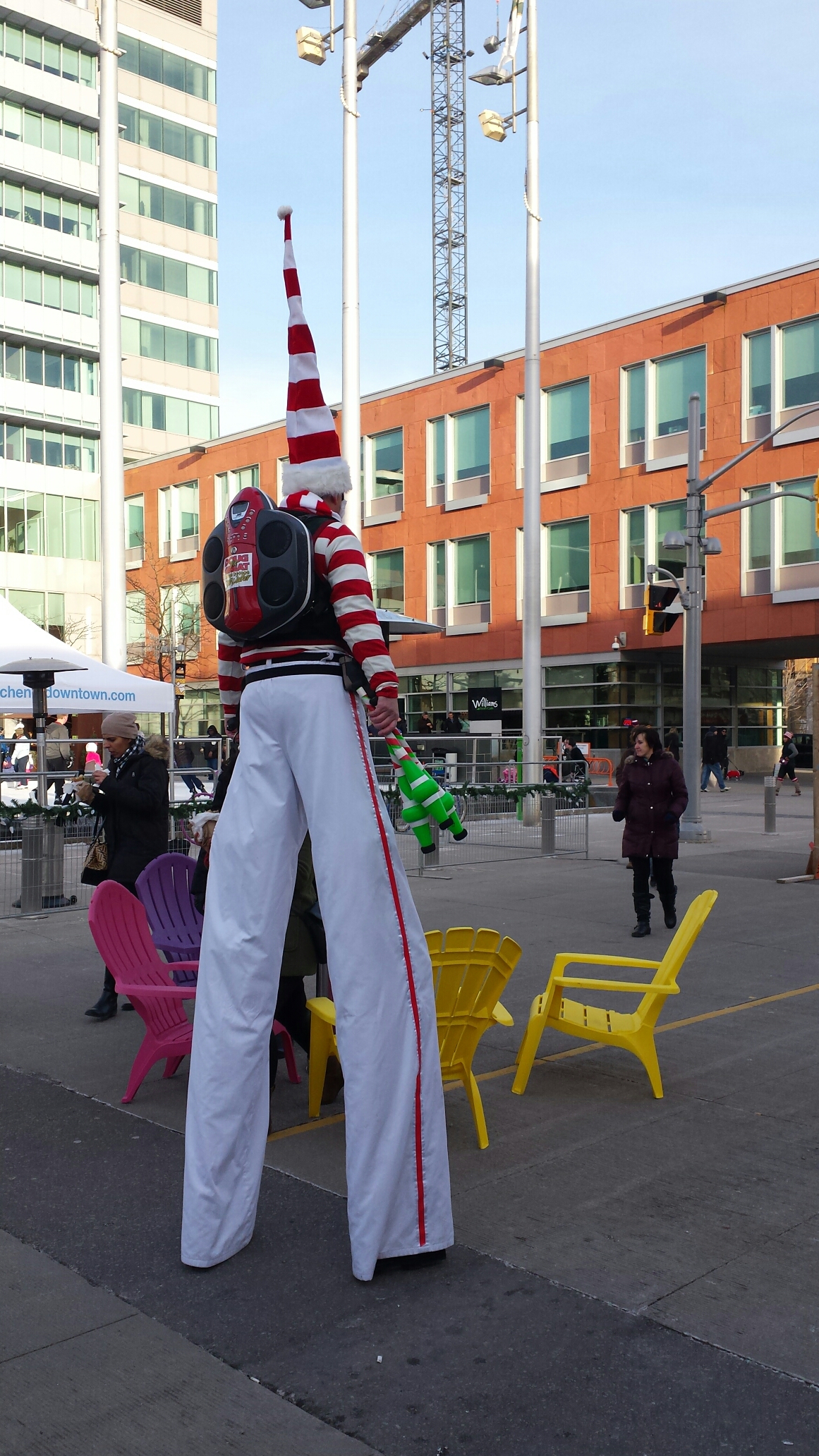 Christkindl is a collection of German traditions in downtown Kitchener. Think of Bavarian Beer Nuts and marzipan pastries on a massive scale, mixed in with jewelery stands, marionette makers, and soap purveyors. This year, there were also some outdoor displays. An artist was working on his ice sculptures along King St. A man on stilts was juggling for the children, while Christmas songs played on a portable stereo attached to his back. There were apple fritters and a collection of singers performing various Christmas hymns alongside skaters enjoying an ice rink.